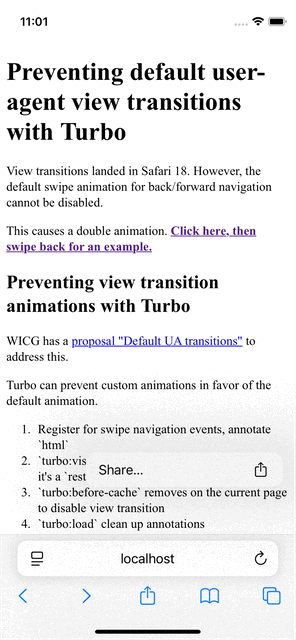 View transitions became available in Safari 18. Turbo had support for this, and the default experience is great in other browsers. There's a small hiccup that the default iOS and Safari browser back/forward swipe navigation animations cannot be disabled, leading to a double animation: